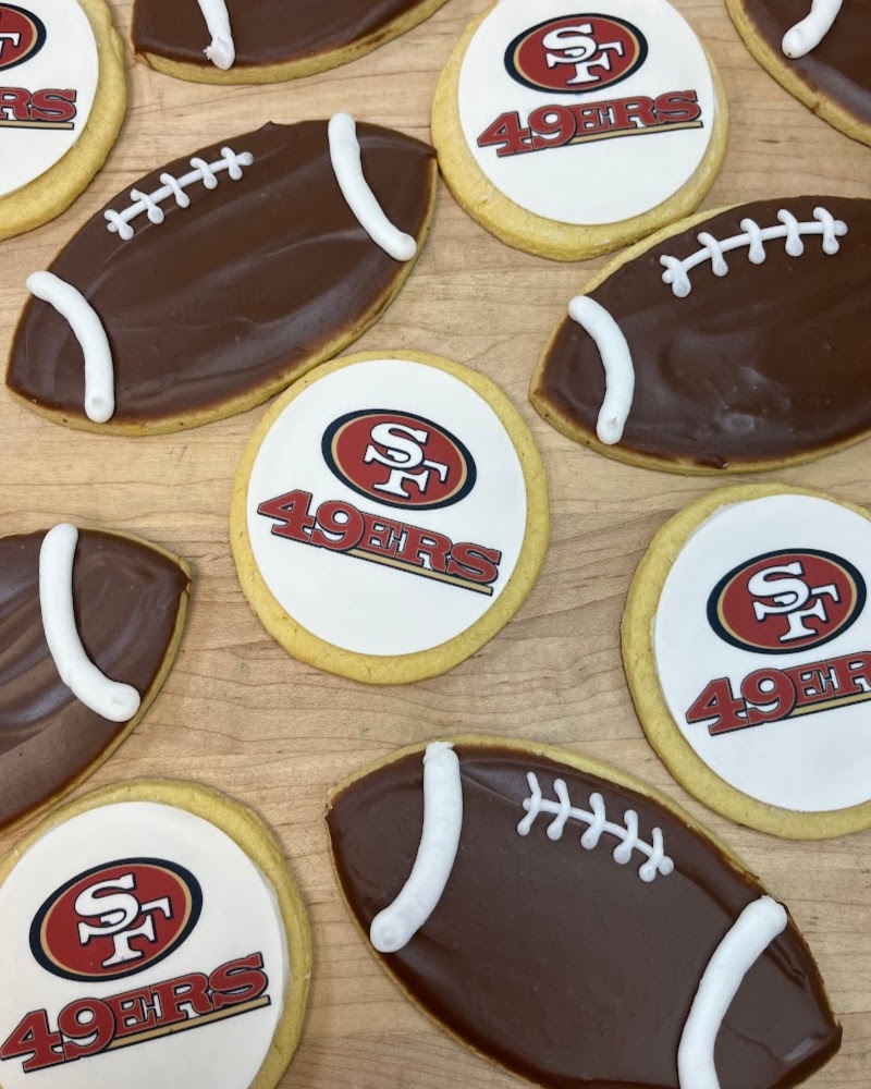 This set of 12 decorated cookies comes with 6 footballs (chocolate iced) and 6 49ers edible image cookies.