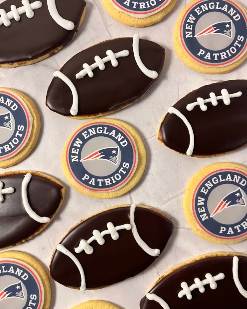 Cheer your favorite team on with this set of 12 cookies that includes: 6 footballs (chocolate iced) and 6 logo cookies.